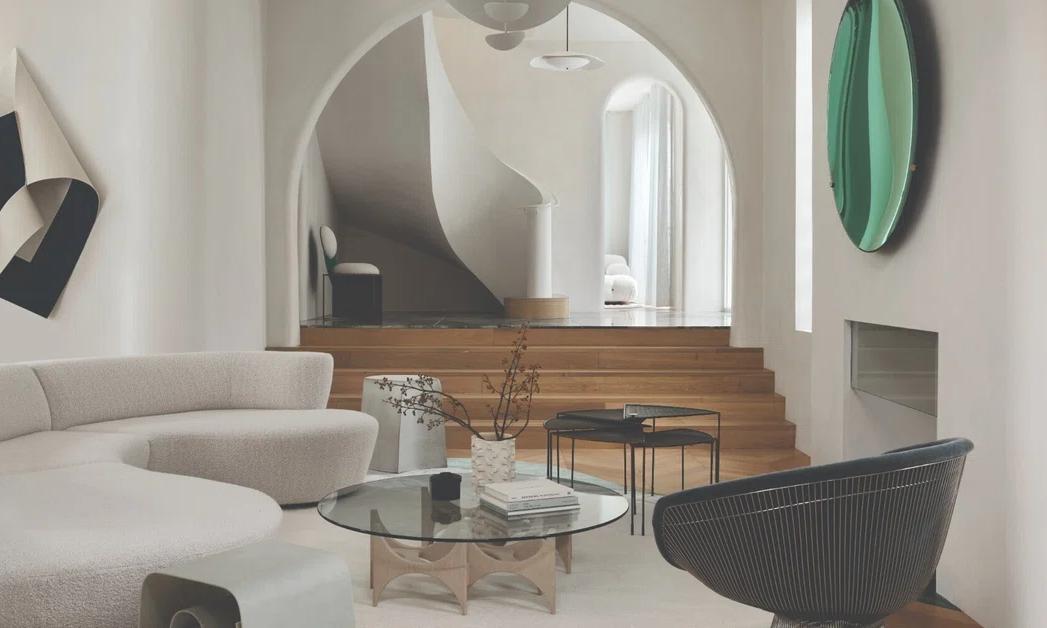 ニューヨークの19世紀タウンハウスを、映画的アール・デコ空間へ。Greg Natale(グレッグ・ナターレ)が手がけた改修は、1970年代ヨーロッパ映画の叙情性を背景に、色彩・大理石・鏡面・アートを重層的に組み合わせた “mise en scène(ミザンセーヌ)”。大胆なフレーミング、ヘリンボーン床、刺繍壁画、合理主義的マーブルパターン、ショップのように演出されたドレッシングルームまで、マキシマリズムとモダニズムの緊張関係が共存する住宅事例。